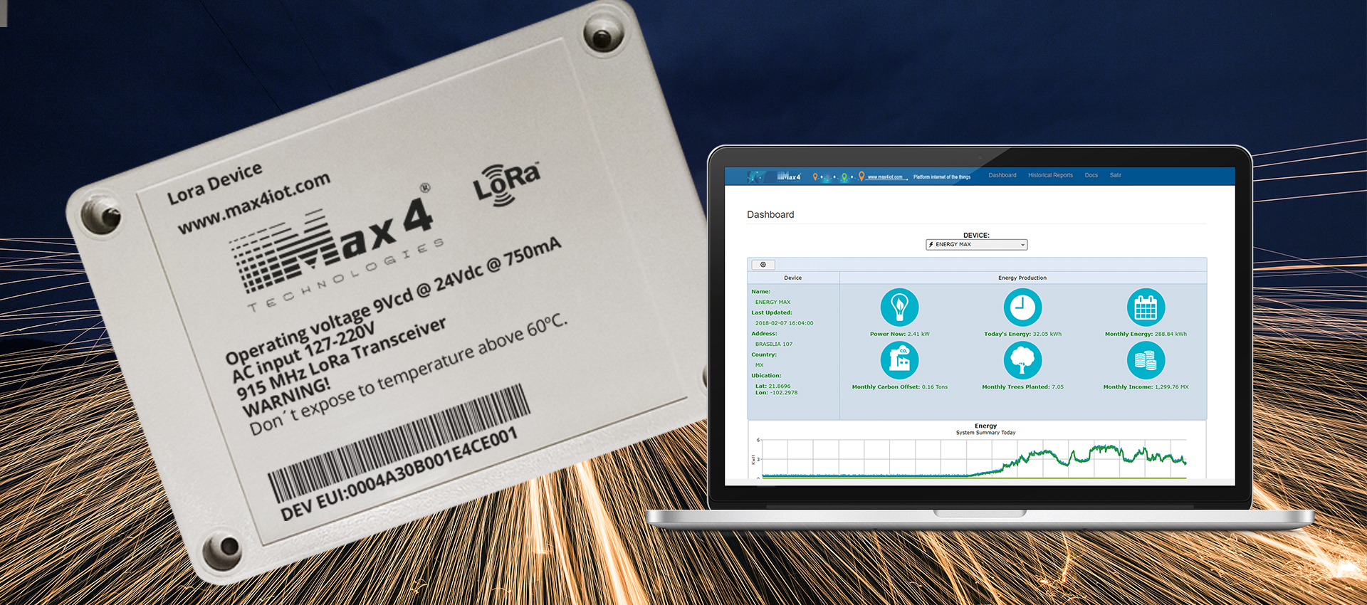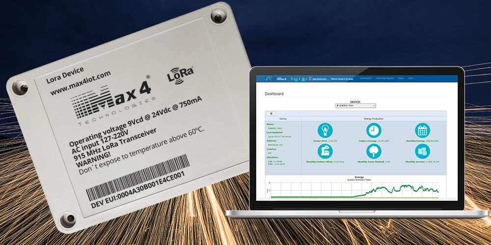 The Max4 Technologies® Energy Monitor is a device dedicated to the measurement of current passing through a cable through a non-invasive form. Uses different protocols to send data to a web platform like for example GSM (3g, LTE), LoRaWAN, satellite, etc.